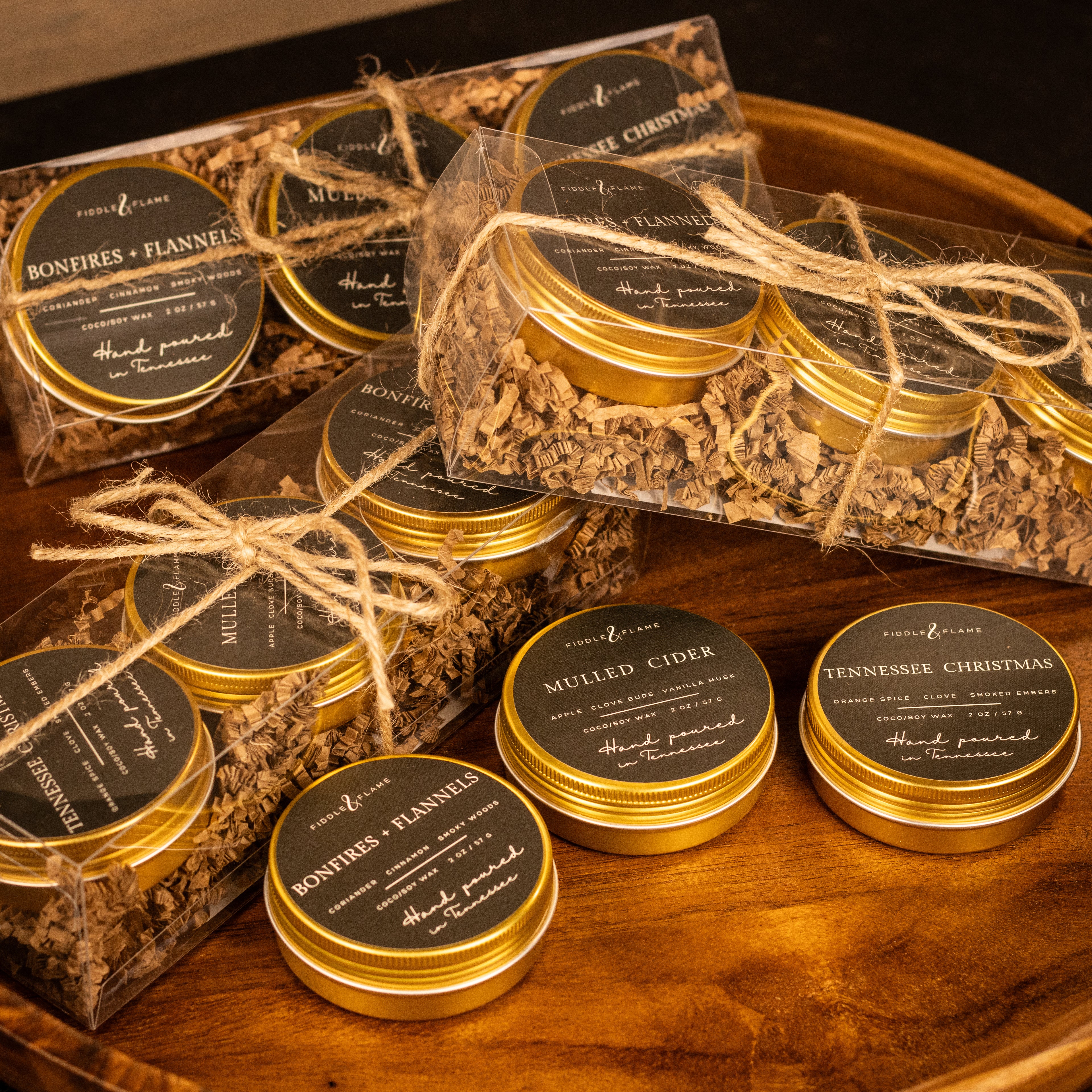 Our 2 oz. gold travel tins are available in all fragrances. Build a "flight" of 4 travel candles and a discounted flight price is applied at checkout.